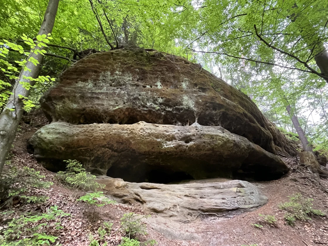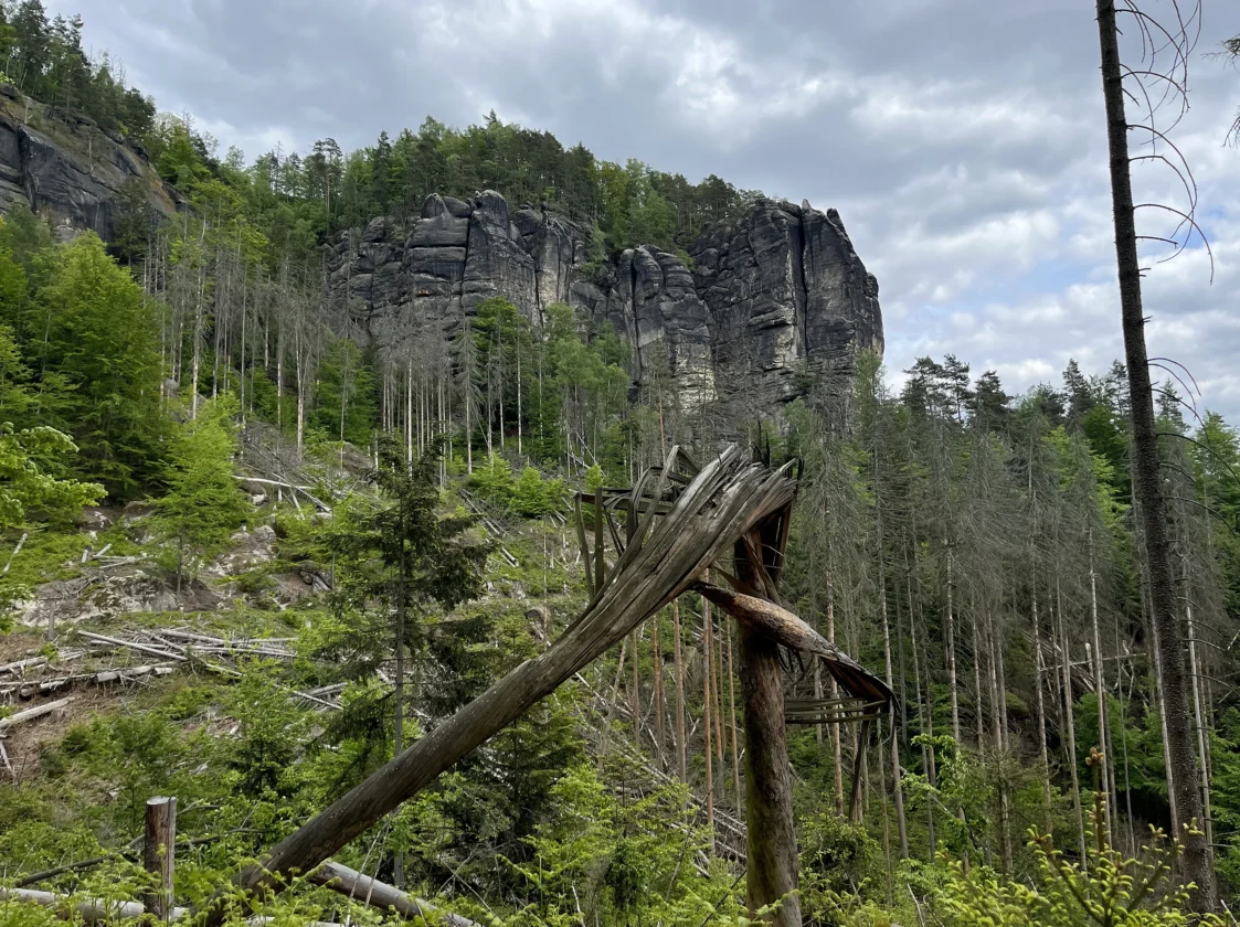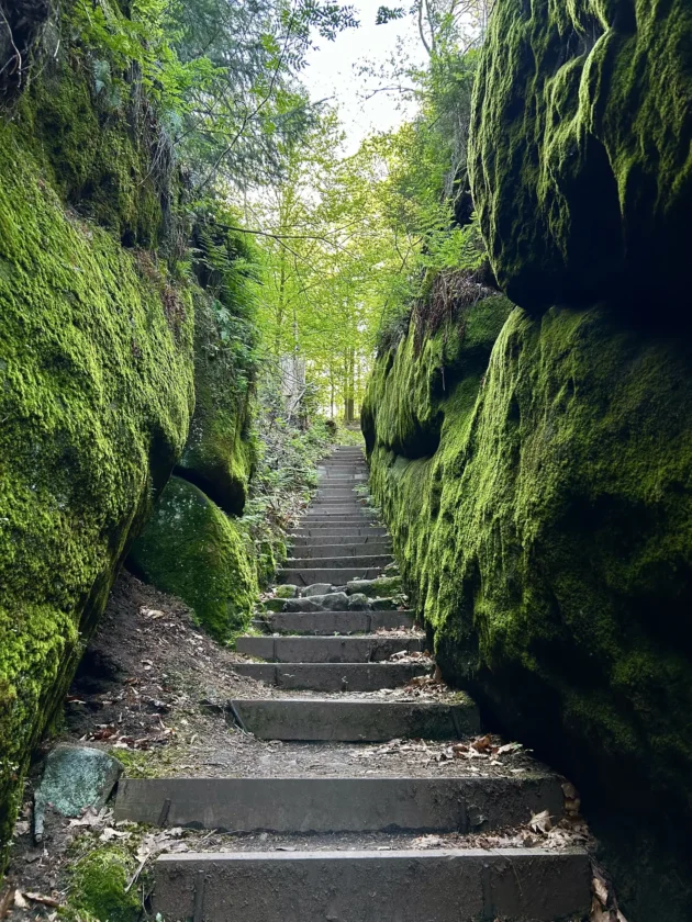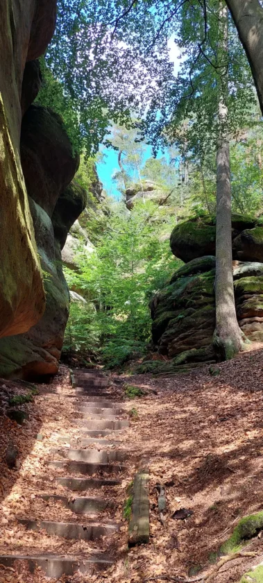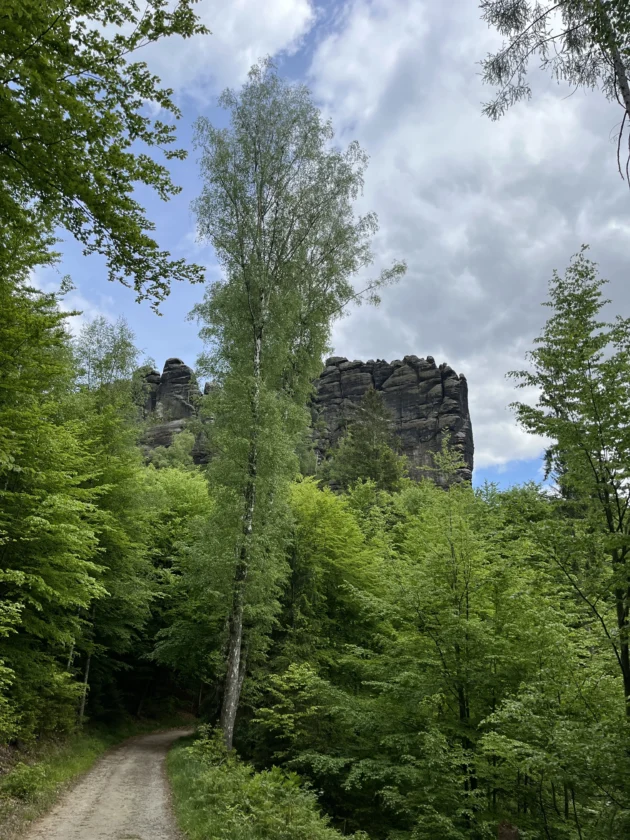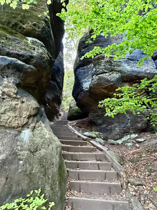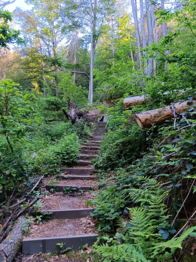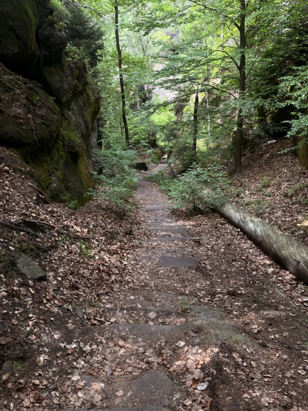 Ab da begann auch unsere Wanderung, für die Mary und ich den ganzen Tag eingeplant hatten. Zu Recht, wie sich schon bald herausstellen sollte. Mit der Fähre setzten wir über nach Postelwitz, einem Ortsteil der Stadt Bad Schandau. Entlang der B 172 gingen wir Richtung Osten bis zum Abzweig Ostrau, wo wir links abbogen. Auf einem Betonweg mussten wir steil bergauf bis zu einer Straße, dann wenige Meter rechts, bis wir linker Hand die ersten Stufen erblickten, die uns hoch zum Obrigensteig führen sollten. Hier ging es in den Wald, wo wir das bei weitem anstrengendste Stück der gesamten Wanderung vor uns hatten: Es waren schier unendlich viele Stufen zu erklimmen – mal in größeren Abständen in den Waldboden eingelassene Stücke Holz, dann wieder richtige Stufen aus Stein. Wir benötigten etwa eine Stunde für den Anstieg. Danach wand sich der Weg hoch über der Elbe: Mal ging es ein wenig bergauf, dann wieder bergab oder einfach nur geradeaus, aber immer am Rand der mächtigen Elbsandsteinfelsen entlang.