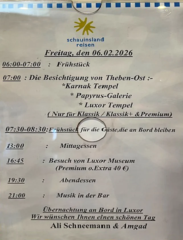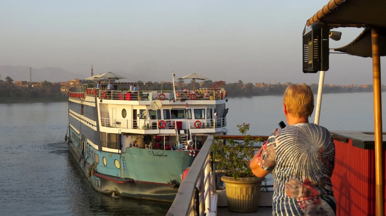Es ist ein unbeschreibliches Gefühl, bei Sonnenaufgang in einem Schiff auf dem Nil wachzuwerden, die Tür zum französischen Balkon zu öffnen und auf den Fluss zu schauen, der träge dahinfließt. Einzelne Fischer waren in ihren kleinen Booten unterwegs, um sich für ihre Familien eine Mahlzeit zu sichern. Da wir uns in der Wüste befanden, waren die Tage heiß und die Nächte zum Teil empfindlich kühl. Wir genossen die Ruhe auf dem Fluss und bereiteten uns auf den Tag vor.
