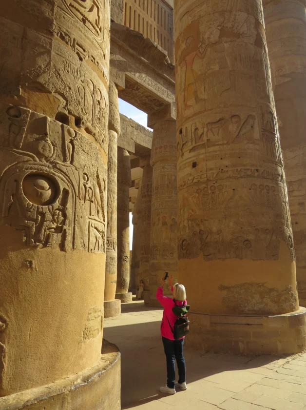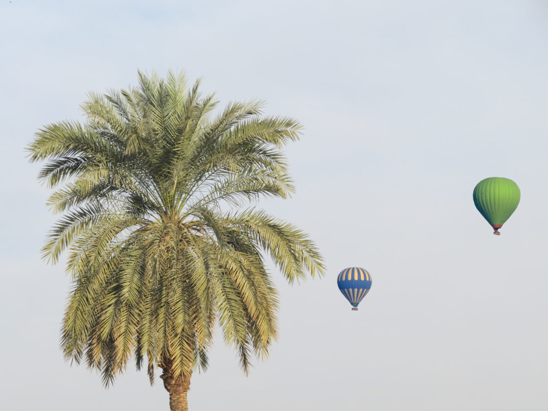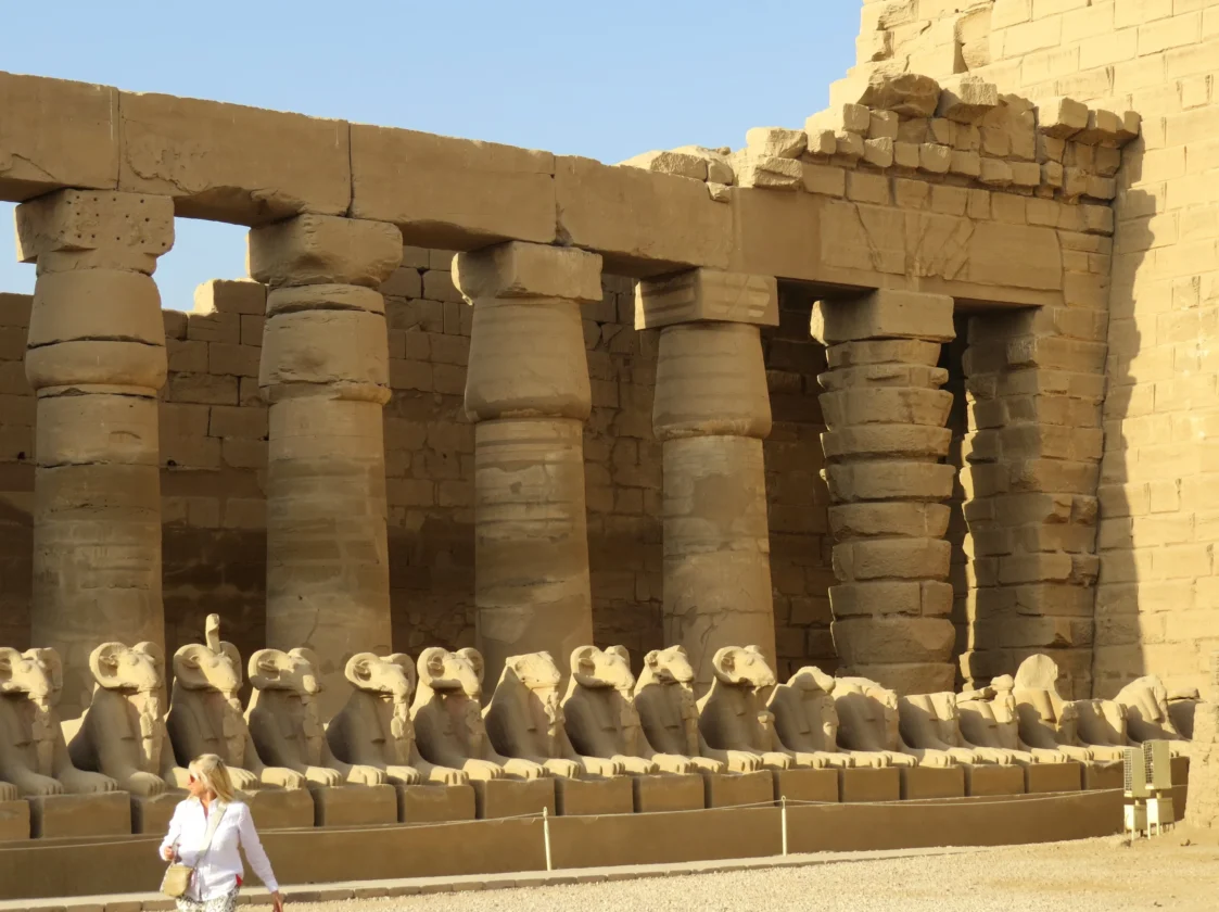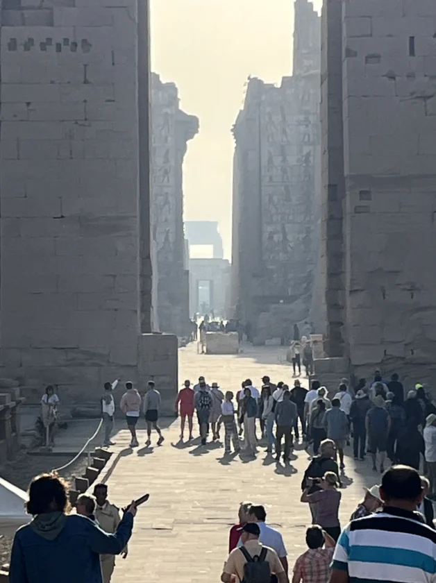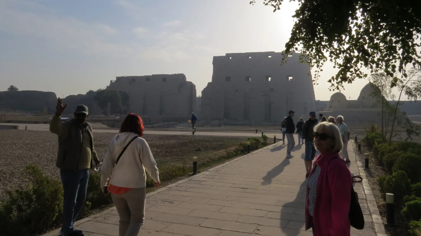 Für die 16 Kilometer bis zum Karnak-Tempel benötigte unser Bus 25 Minuten. Einen Teil der Strecke fuhren wir an einem Kanal entlang. Ehe wir schließlich die beeindruckende Anlage betraten, sahen wir noch, wie langsam einige Heißluftballons in den dunstigen Himmel aufstiegen. Mittlerweile war man auch erfreut darüber, dass wir um 8 Uhr tatsächlich zu den ersten Besuchern gehörten.