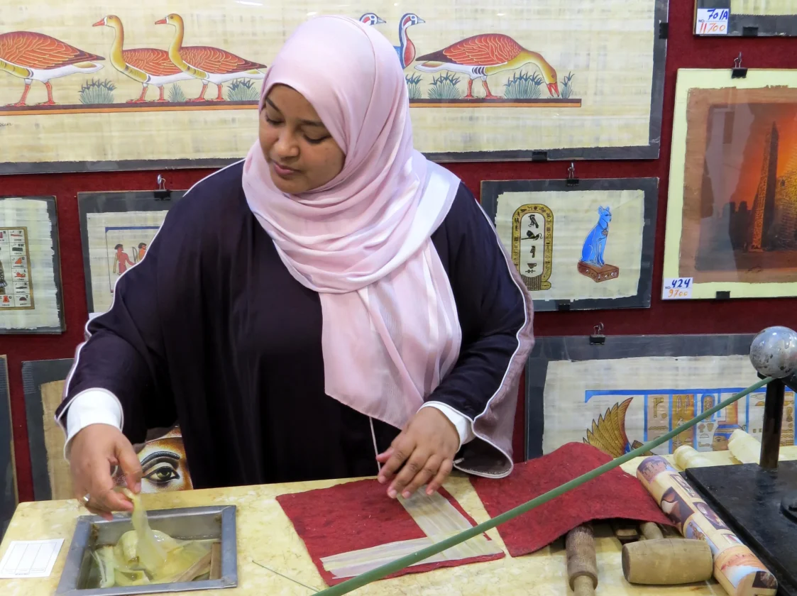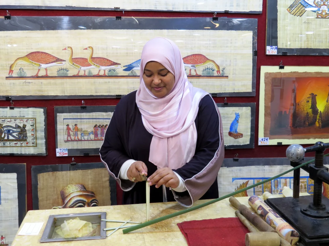 Bis zur Galerie waren es nur ein paar hundert Meter. Hier zeigte uns eine junge Angestellte sehr anschaulich, wie aus der Papyruspflanze ein Blatt entstand, auf dem man schreiben konnte und das sich auch bemalen ließ. Wann das erste Blatt angefertigt wurde, ist allerdings nicht genau bekannt.