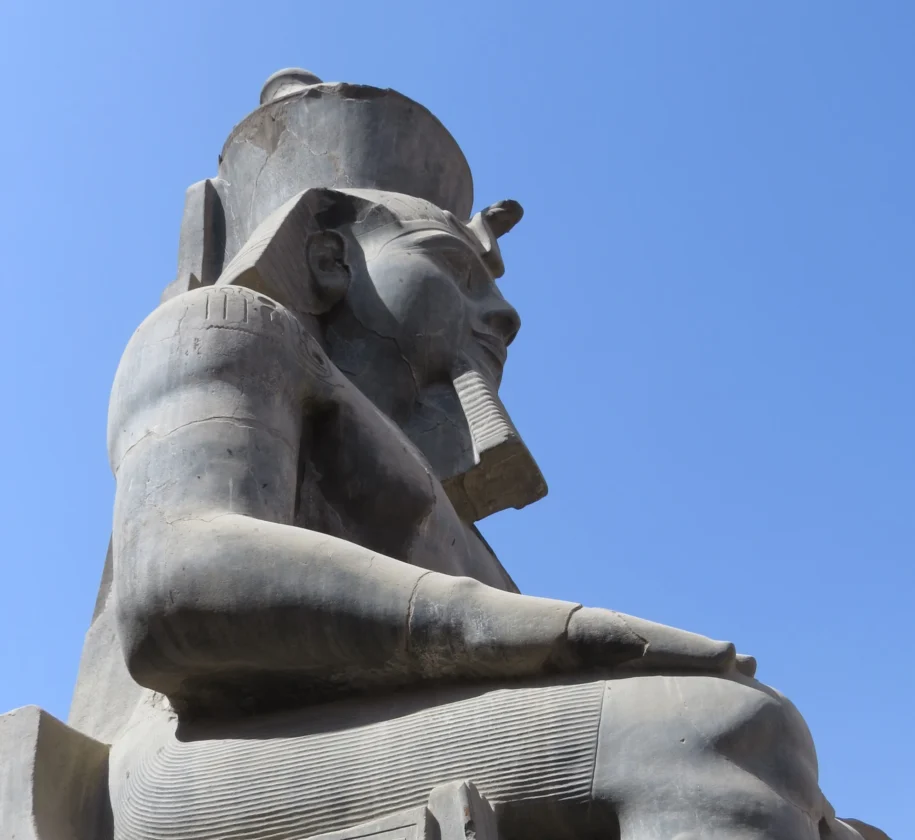 1500 Jahre existierten vor dem Pylon lediglich die beiden sitzenden Statuen sowie eine schwer beschädigte stehende Statue auf der Westseite des Pylons (1. Foto unten, ganz rechts im Bild).