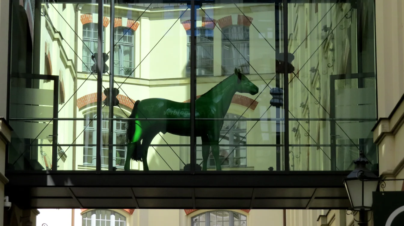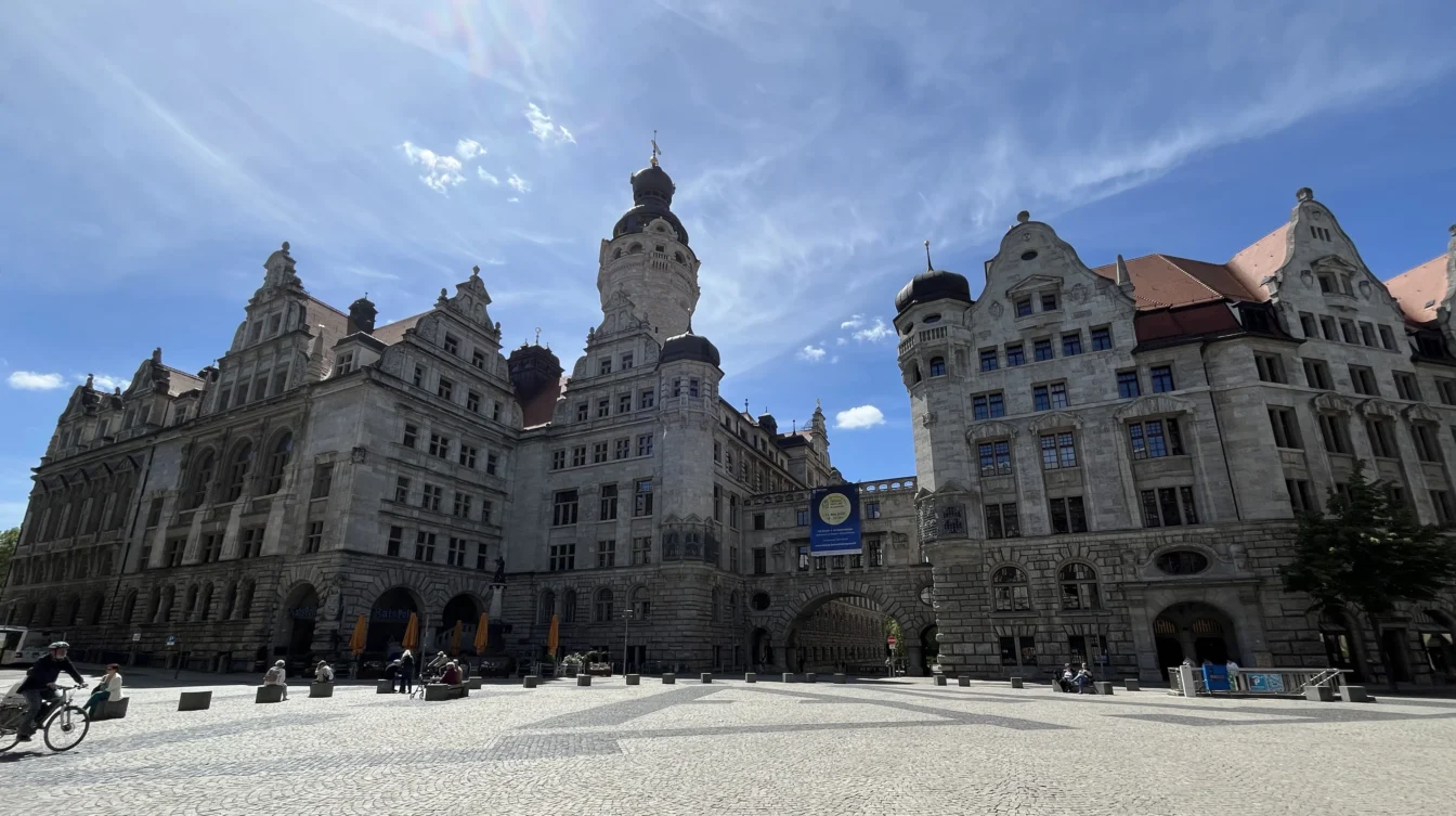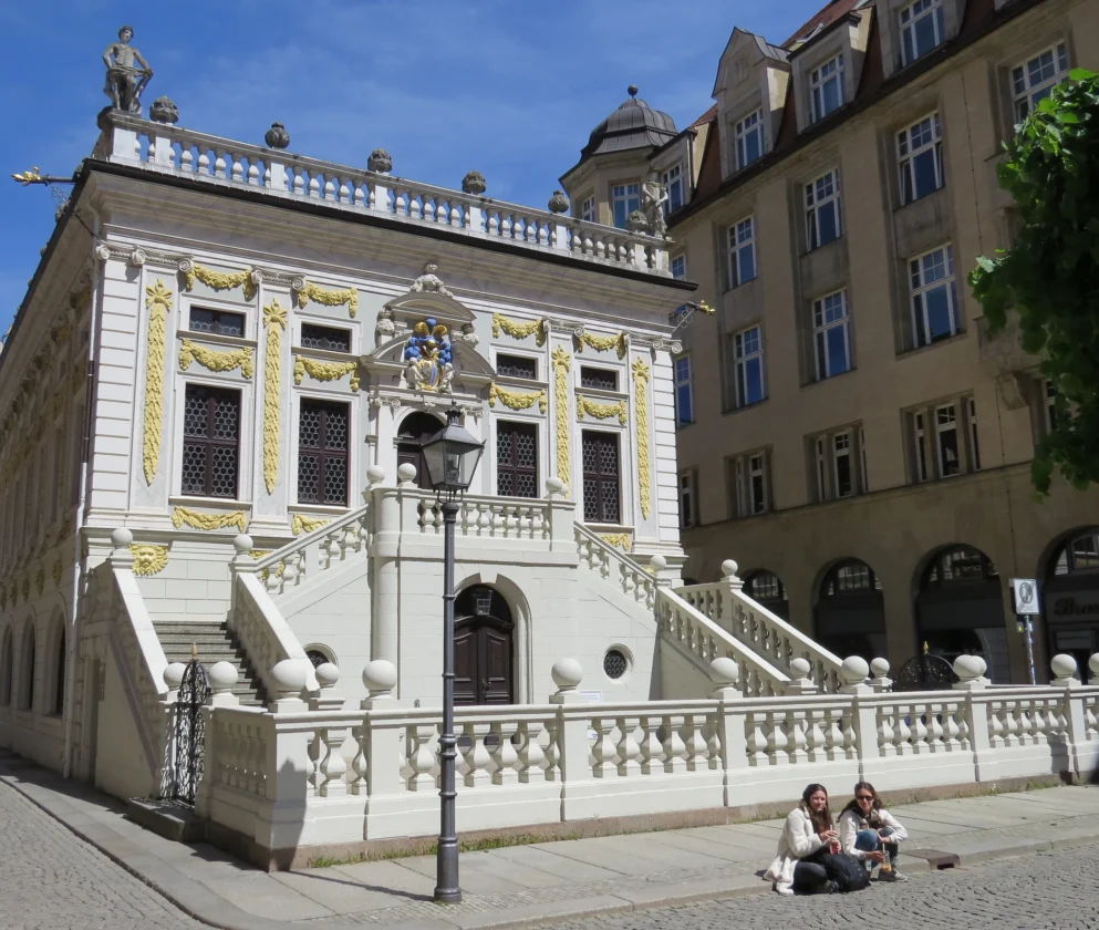 Pünktlich um 11 wurden Mary und ich zusammen mit ein paar anderen Menschen von unserem Guide am Haupteingang zum Gewandhaus begrüßt, den wir über GuruWalk gebucht hatten. Wie uns mitgeteilt worden war, trug er einen grünen Regenschirm als Erkennungszeichen. Auch für einige englischsprachige TouristInnen gab es einen Guide. Soviel vorab: Die Organisation war perfekt und unser Stadtführer absolut professionell!