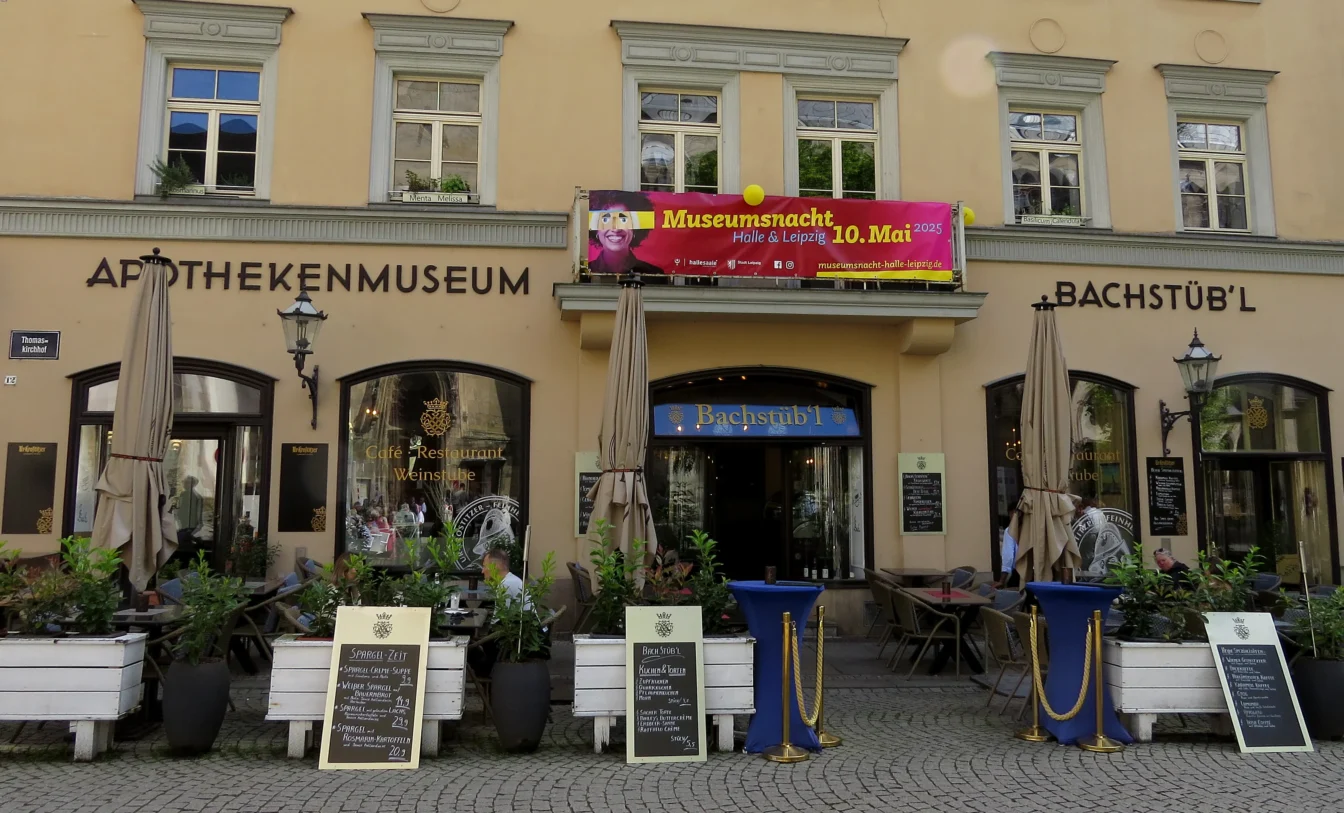 Nach diesem informationsreichen Vormittag suchten wir uns einen sonnigen Platz für unser Mittagessen. Im Bachstüb’l nahe der Thomaskirche wurden wir fündig, zumal ich dort Tiegelwurst (auch bekannt als Tote Oma) bekam, wonach ich schon länger gesucht hatte.